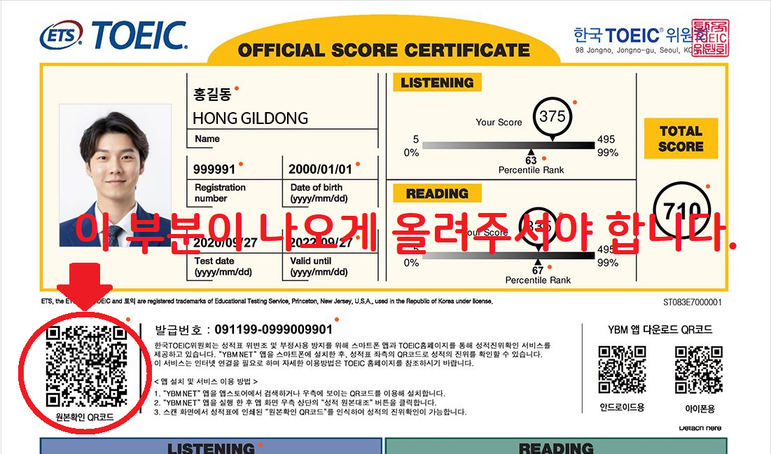 ★파일 제목은 “20123456-홍길동-토익성적표.pdf”로 작성★